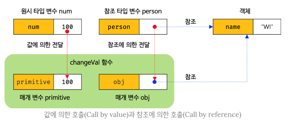 - 값에 의한 호출: 함수 호출시 매개변수에 원시값 전달