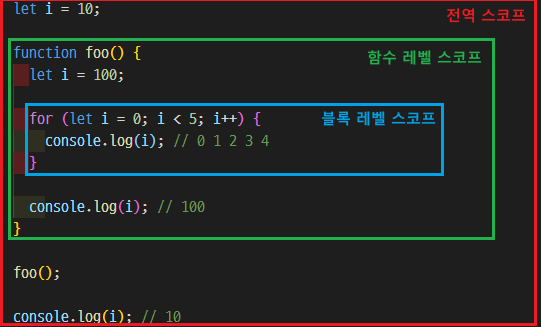 - let 키워드는 모든 코드 블록(함수, if, for, while...)을 지역 스코프로 인정하는 블록 레벨 스코프를 따른다.