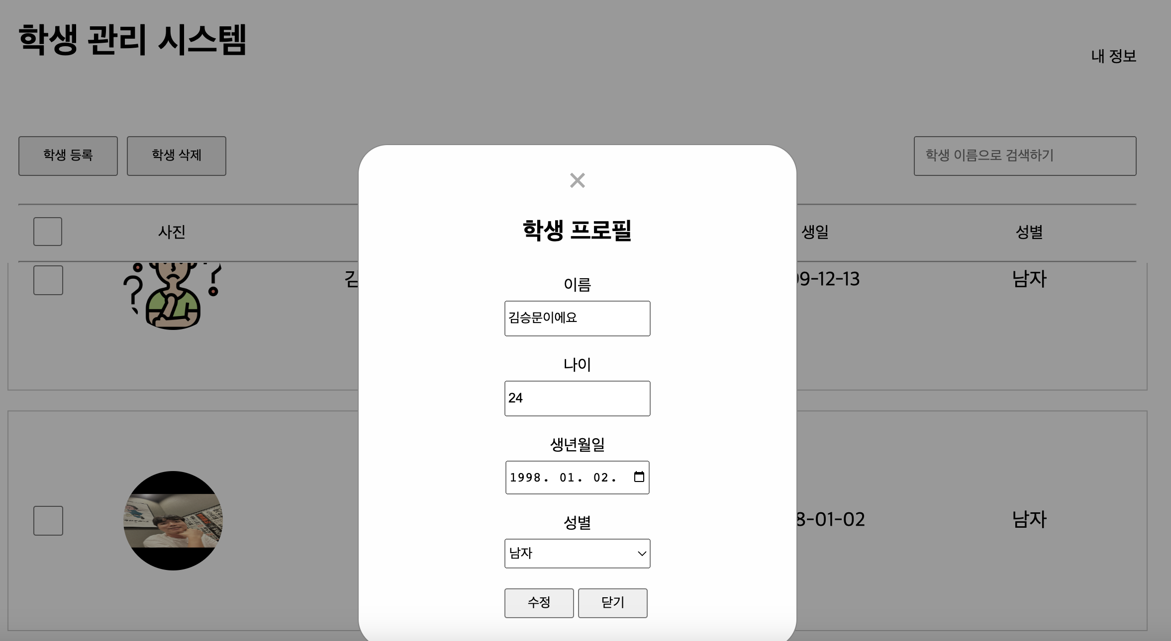 학생 정보 수정 화면